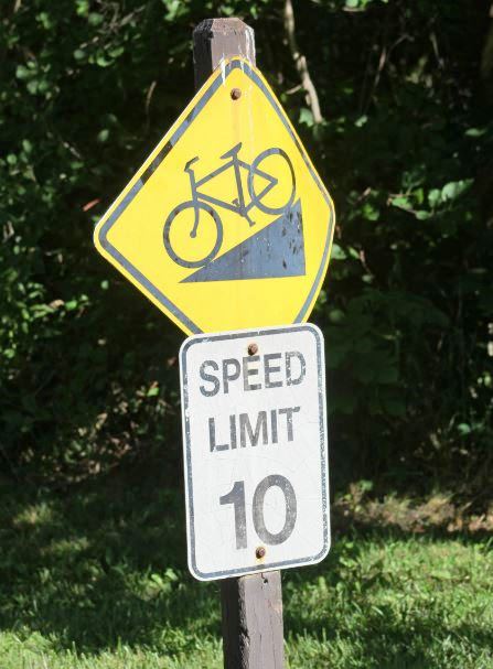 One of their sons was just learning to ride a two-wheeler without the training wheels and they were encouraging him to make that slow climb up the hill. Because he had a lot of trepidation, I walked down and encouraged him too. So, after he made it to the top we all applauded and Dad clapped him on the back, said “that’s my boy” and the youngster just beamed. Mom was towing another child and an older child was up ahead. This is the pathway looking down and a sign advising of the sharp incline.