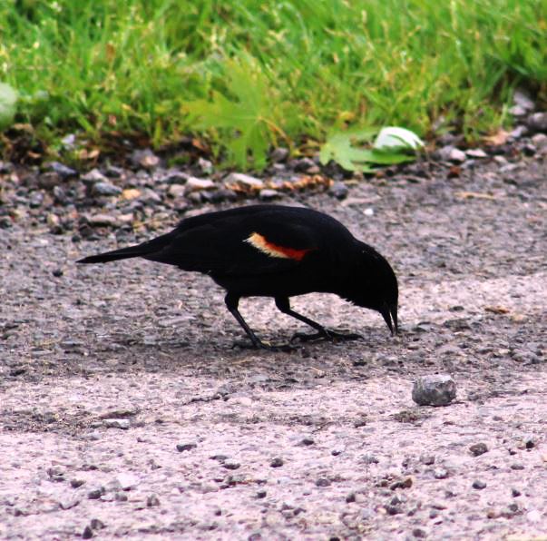 I was amazed at its actions since the baby did not seem to be injured, but indeed dead. But perhaps a predator bird had grabbed it and dropped it and it was still alive before I happened by. Red-winged Blackbirds are beautiful, but they are mean. I shooed them away from a Robin’s nest one year … it was a low-hanging branch and the Mama Robin was off the nest and the R-WB tried to get the eggs, then later in the week, the nestlings. I’ve seen them peck on the necks of full-grown geese. They do like peanuts – over the years I have gotten a few pics of the R-WB on the ground scamming peanuts, probably before we “met” and yes, I remember “The Birds” which was some kind of scary.