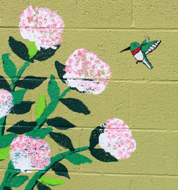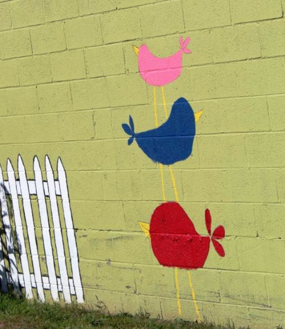 The sunflower painter has more patience for this sort of thing than I’ll ever have. They must’ve had a ladder in their back pocket too. The mural is nice but my choice is the multi-level birdhouse in the garden. The colors seem to be deliberately chosen to reflect its natural surroundings.