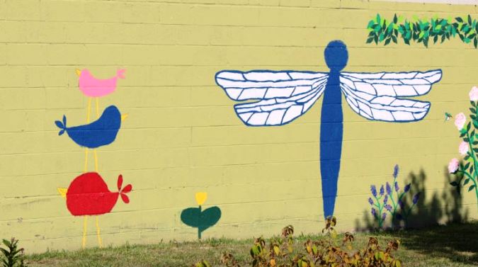 The sunflower painter has more patience for this sort of thing than I’ll ever have. They must’ve had a ladder in their back pocket too. The mural is nice but my choice is the multi-level birdhouse in the garden. The colors seem to be deliberately chosen to reflect its natural surroundings.