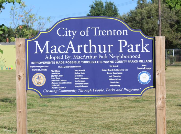 So, once the paint dried on a multiple-mural artistic endeavor in Trenton which was created to celebrate that city’s official designation in 2021 as a “Pure Michigan Trail Town” I headed to that venue to check it out. The artwork consists of multiple sides with murals featuring images of Summer activities promoting a healthy lifestyle like hiking, biking and kayaking, plus a nod to the flora and fauna found at beautiful Elizabeth Park.