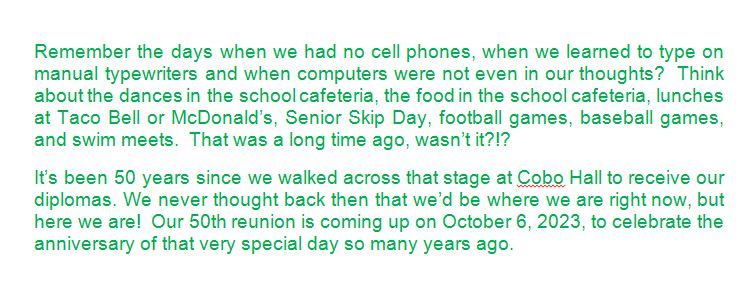 Last week I received an e-mail – the re: line was “Hello, Dear LPHS 1973 Classmate!” and the topic was our LPHS 50th Reunion. Even though my previous RSVPs were a hard “no” it seemed the flyer attached to the e-mail was supposed to evoke fond memories, i.e.: