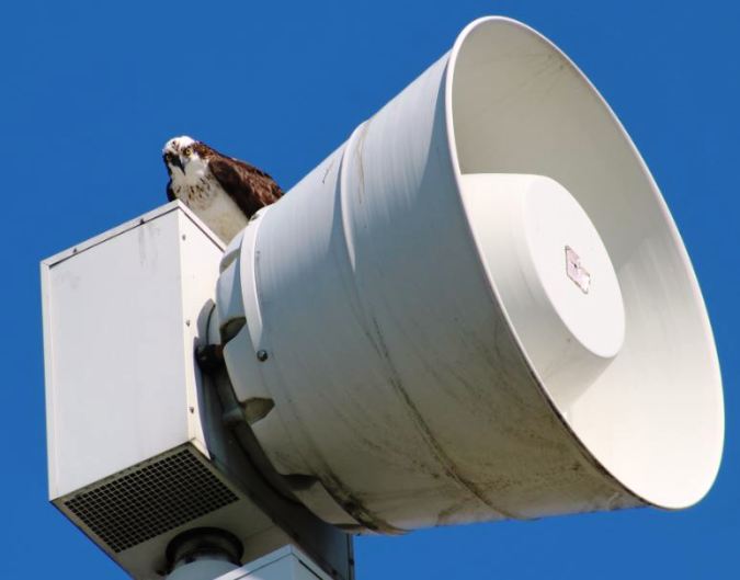My thought as well! Surely the siren has gone off a few times since the nest was built. I imagine loud squawks and a cloud of feathers as the ospreys are scared out of the nest, quick to return when all is quiet. Hopefully the gulps just stay put, cover their ears, and wait for Mom & Dad to return.