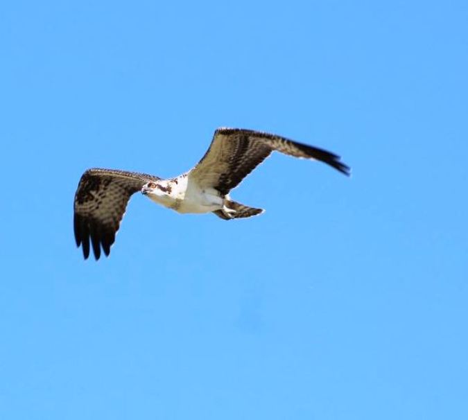 First, how to tell male and female Osprey apart. Had the pair been perched side by side, I would have seen that the female was 20% larger than the male. They weren’t anywhere near one another, so I also learned that the female has a darker “necklace” at her neck and chest area than the male which has much lighter markings. That is evident in these photos.
