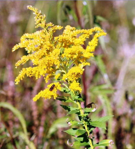 I eventually navigated toward a cement path, which I was happy to find since the grass was still damp with dew. A random Goldenrod plant along that path had me stopping to get up close to this fuzzy, winged creature …