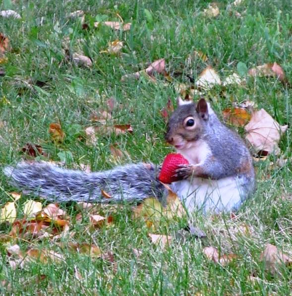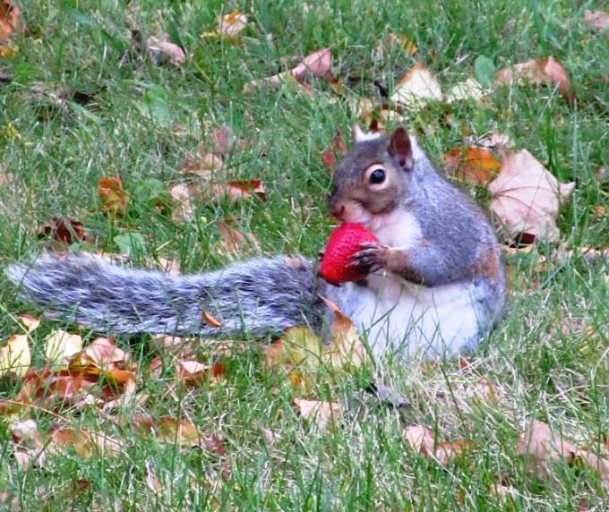 That strawberry looked delicious Laurie! I was surprised to see the squirrel(s) have another benefactor doling out treats to them and a generous treat at that – this was in October, so not from their garden. I figured people would think it was my doing, so I had to come clean!