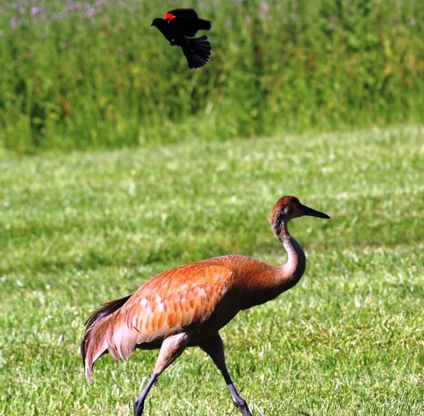 Me neither Kate – it’s like David and Goliath. The Sandhill Crane could just stomp on that Red-winged Blackbird with one huge webbed foot.
