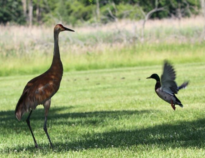 Raj, I never hear of the Sandhill Cranes attacking other birds, even though they are so big. Probably most smaller birds would be afraid of them due to their size, but the Red-winged Blackbirds pick on all birds (people too during nesting season if you get too close to the nest). I’ve seen them pick on geese, pecking them on the neck and head.