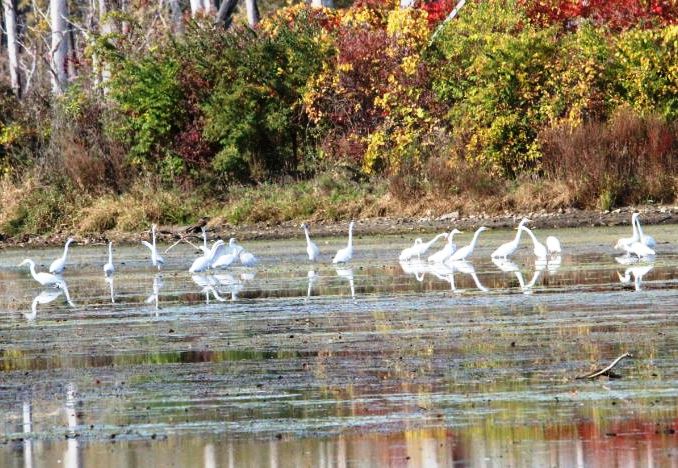 After rounding a bend in the trail, I came upon a group of Great Egrets. It was a beautiful sight, even more stunning because of their reflections. Due to those double images with way too many long necks, it was impossible for me to guess how many Egrets I actually saw. They were very loud, chattering amongst themselves, perhaps discussing their migration flight plans as our Great Egrets usually depart Michigan by early November.