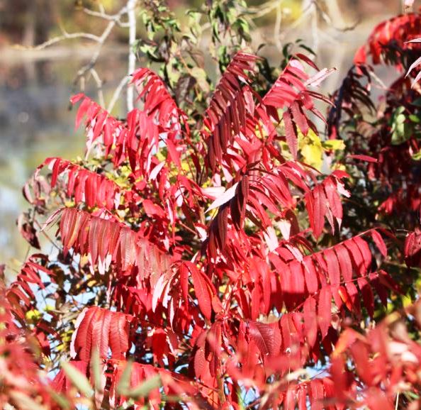 I continued on my way, as leaves fluttered down and swirled around me. I stopped to take photos of a few spots of bright red Sumac leaves and some teasels popping up in those Sumac leaves …