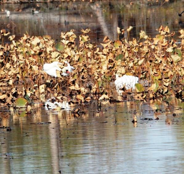 First, I walked down to the shoreline near the gazebo while peering for Pelicans in the location Mike mentioned and was happy to see several flashes of white embedded in the now-brown Lotus leaves across the lagoon …