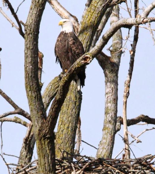 Occasionally I stopped to look up and locate the two trees, home to two nesting Bald Eagle families. I found those nests, along with a Bald Eagle guarding its nest.