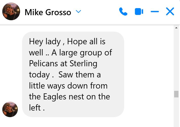 About ten days ago, a little birdie suggested I go to Sterling State Park if I wanted to see White Pelicans. That “birdie” was Mike Grosso, a local photographer I’ve followed on Facebook for awhile. Earlier this year I asked Mike if he ever encountered White Pelicans since he never posted photos of them. (Mike posts mostly Bald Eagle and Osprey photos and fantastic sunrise shots.) Well Mike remembered my question and sent me this message and posted a few Pelican photos the same day.