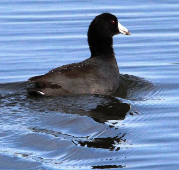 I kept walking and decided to just turn around and double back, hoping for another Bald Eagle sighting, but I had no luck in that regard. However, I passed a raft (group) of American Coots, which I recognized by the white bill which extends from the forehead. My new bird of the day!