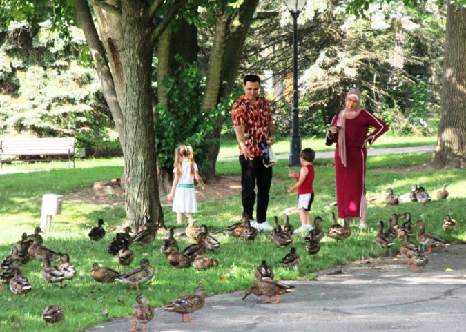 But, on this day, there was a man and woman with two kids.  I’m assuming these were the parents and they were toting a couple of bags of bread chunks which they portioned out to the kids to toss to the ducks.  I’m also assuming they similarly tried feeding the geese and likely had a stampede of geese coming toward them, so they quickly moved along the grassy shoreline to the more sedate Mallards.