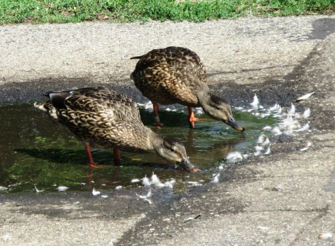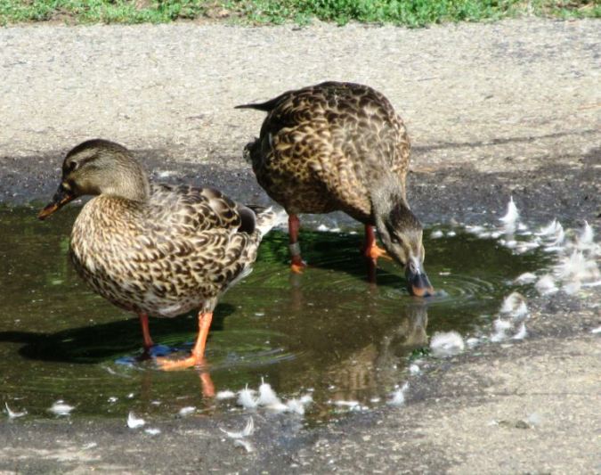 The few Mallards that chomped on tidbits were thirsty and quenched their thirst in a feather-filled puddle.