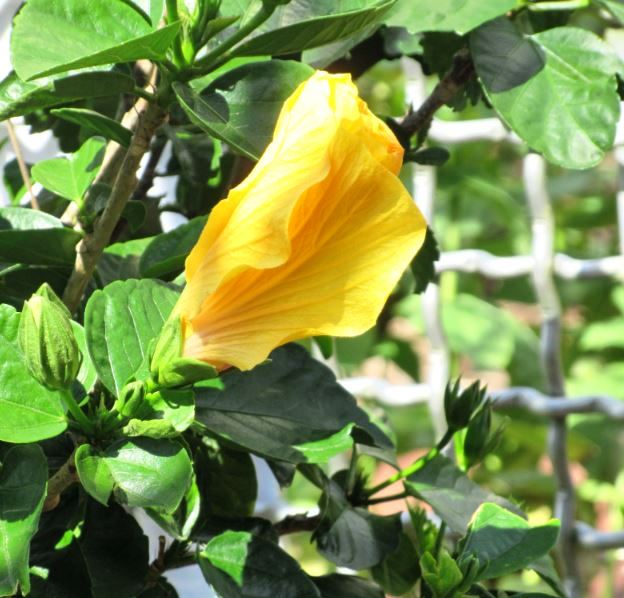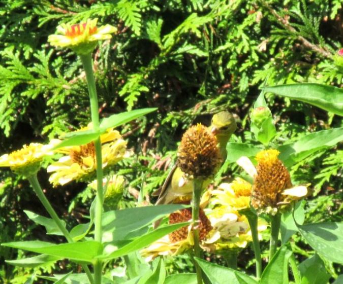 I walked the long way to the Botanical Gardens, hoping for a hummingbird to happen by.  But nope, no flowers enticed them, nor the butterflies or bees either.  I did see a Goldfinch nibbling on a yellow flower – I don’t know if it was a female or a male as they similarly molt that time of year.