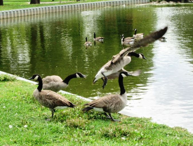 They were all stirred up about something, emitting honks amongst themselves.  There are many geese at this park and they just meander around, only becoming fitful when their goslings are in tow and they deem you a threat.  The rest of the time, they’re okay with humans, so what set them off?