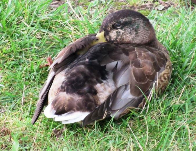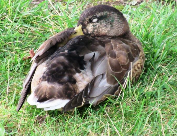 But, in the interim, losing their feathers zaps their energy and they feel and look lackluster – there’s a lot of snoozin’ going on, like this guy, who sleepily watched me, then couldn’t keep his eyes open. This is a Mallard Drake – you can see a little bit of its teal head feathers returning.