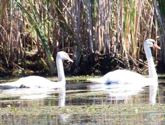 Even from afar, it is easy to distinguish between the male and female Mute Swan by the predominant black knob at the base of the bill; it is not as predominant in the female. Notice Mama and Papa switched places for this photo!