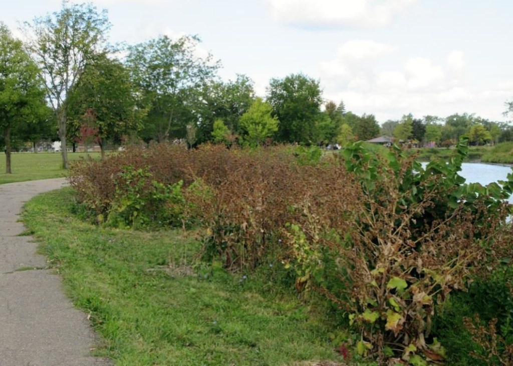 Like the expression “two out of three ain’t bad” I breathed a sigh of relief that some vestiges of my favorite nature nook were intact, even if those “promised” native plants to be planted by the Friends of the Detroit River were absent and in their stead were weeds, some towering way over me.  I saw no waterfowl in the Creek, but its water was blackish and the water level was low that day. Ugh!