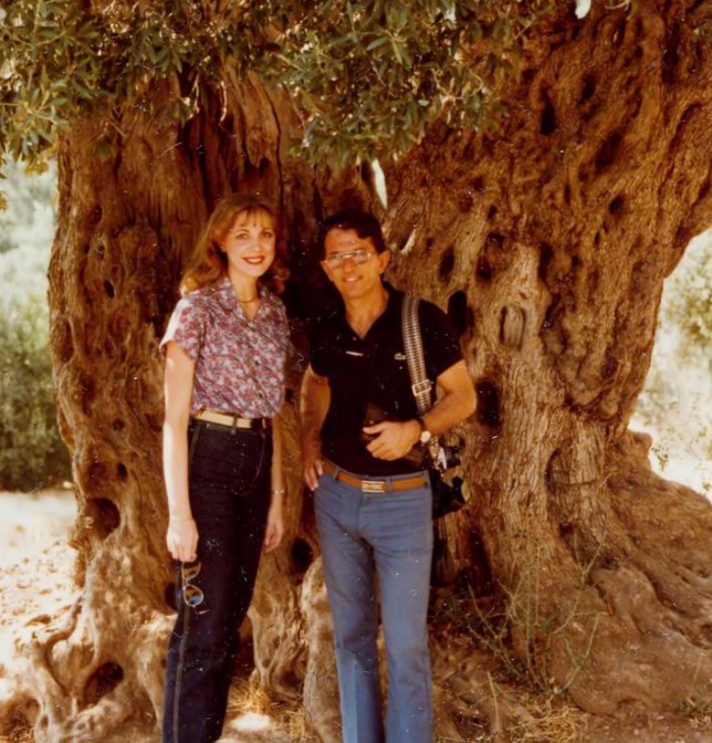 After booking a Greece land tour/Greek Islands cruise for 1981, my parents bought me a Canon AE-1 35mm camera, along with a photography class. I was lucky because our American Express tour guide for this entire tour/cruise, Antony Sofianos, had the same camera as me, so he gave me lots of pointers. Antony often took photos of me using my camera during that two-week trip. Here we asked another tour member to get a photo of the two of us, Antony with his camera in tow, in front of the oldest olive tree in the world.