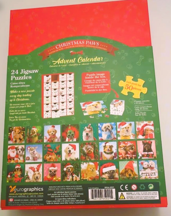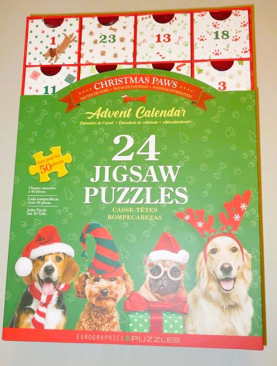 Speaking of gifts with multiple pieces, I bought a fun early Christmas gift for myself, an Advent jigsaw puzzle of dogs dressed in festive holiday wear.  There are different types of Advent jigsaw puzzles – some are for 12 days, some 24 days and others you have a “master puzzle” and add new pieces to it every day for 24 days.  I opted for doing a new, 50-piece mini-puzzle daily for 24 days.