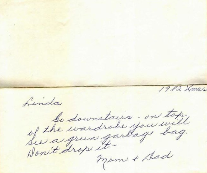 Then there was the farm set that I (finally) got for Christmas at age 26.  This gift was a joke of sorts, because as a young girl, I asked Santa for a toy farm set one year.  I had visited a family member’s farm where I got my pet rabbit “Scratch” and was enamored with the barnyard animals.  Admittedly, toys in the 50s or 60s were more gender specific, i.e. girls played with baby dolls, boys with trucks and GI Joes, so it was suggested to me nicely that “little girls don’t play with farm sets” … but, lo and behold, for Christmas 1982, there was a small package under the tree with this note on Christmas stationery inside …
