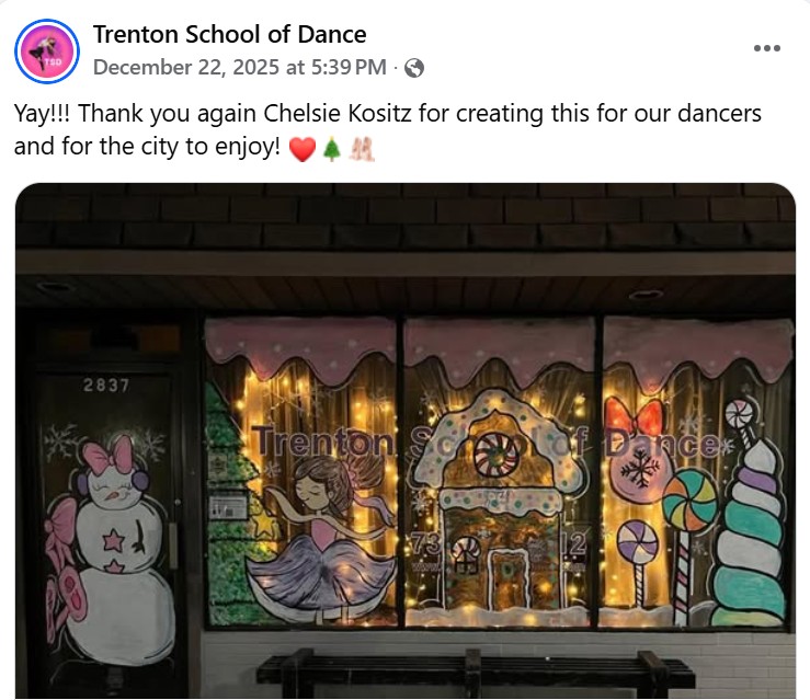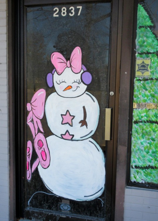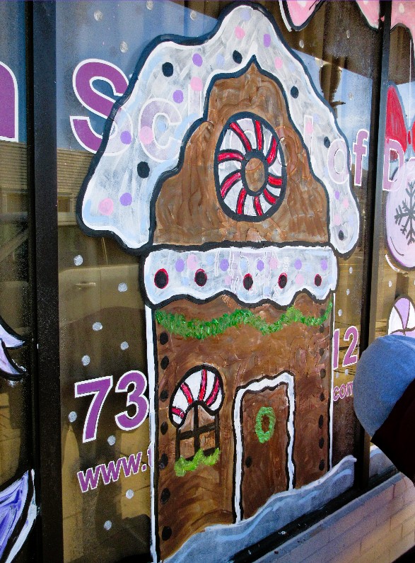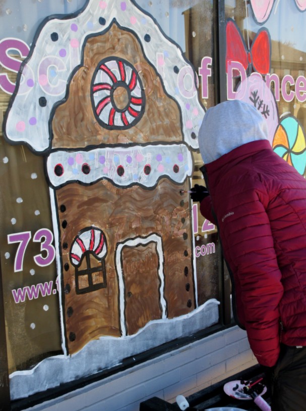 Chelsie is a local mail carrier and her daughter takes lessons at this dance studio, so every year she paints a Christmas theme on the studio’s windows in conjunction with the City’s business district holiday window-decorating contest. Chelsie told me the decorated store windows look festive for the annual Christmas parade along West Jefferson Avenue.