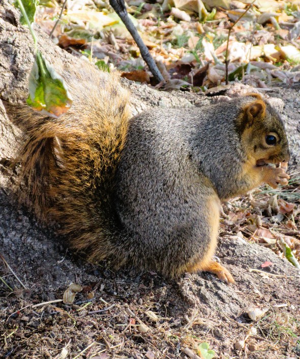 Yes, I was the interloper that tried to intrude on their routine, even though I was not that close to them.  This squirrel reminded me of my sweet Parker, not only in looks, but how he would not tolerate another walker who waylaid me on the perimeter path, thus delaying dispensing of peanuts, so he’d run over and stomp on my shoe, or try to scale my sweatpants.  Once he jumped like a pogo stick to reach the bag in my hand.