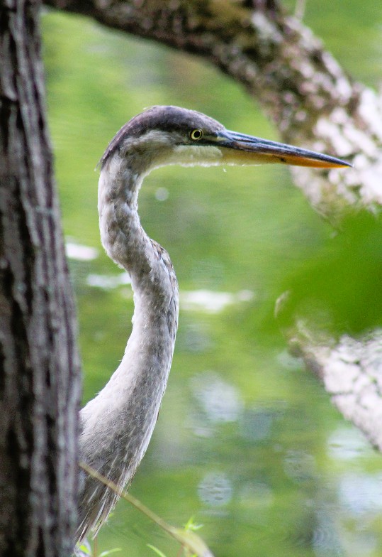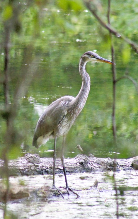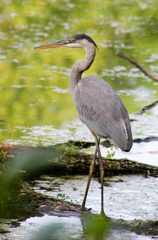 I saw this Great Blue Heron, also pictured up top.  Quickly I hid behind a tree to watch it – whew, it didn’t see me, as it would have spooked and taken off.  I watched the heron as it studied the water, scoping out any movement signaling a fish or frog that might be a potential lunch.  In my haste to evade the heron, there was a branch in my view, but even moving slightly would spook my feathered friend, so I stayed put.  The heron never caught a fish.