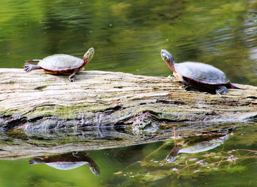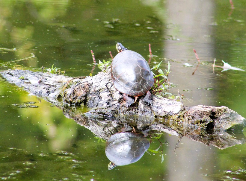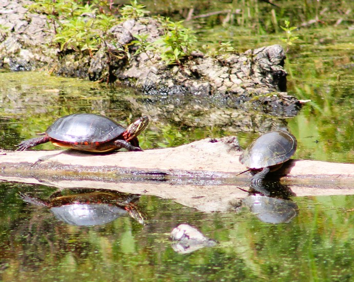 There were a ton of turtles sunning on various fallen logs, most of them on the opposite shoreline.  But these Painted Turtles were close to me, so I was able to get not only photos of them, but their near-perfect reflections as well.