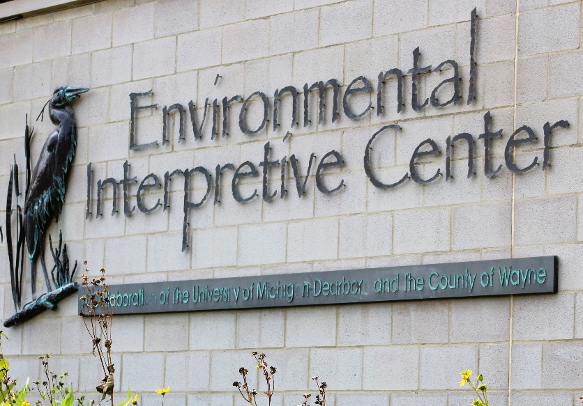 Once I left the trail that runs parallel to Ford Lake, I walked through a woodsy area before reaching the Environmental Interpretive Center (“EIC”).  There had been no further critter encounters and the birdfeeders were empty, so no woodpeckers or jays were hanging around.