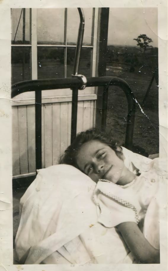 During her stay at the Hospital for Sick Children, in the Summer months, Pauline was transferred to Thistletown, a satellite branch of the hospital, where long-term patients could convalesce outside, weather permitting. This a picture of Pauline in her hospital bed outside.