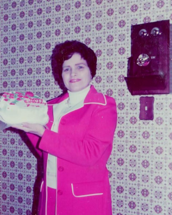 I decided that Mom’s 50th birthday should be a special celebration, so I wrote a letter to Nanny and Frances to ask if they would come over on the Greyhound bus on February 13th to surprise Mom. We communicated our plans by phone at the diner where I worked through college so Mom would not find out. I did not tell my father as I didn’t want him to blab the secret. We were excited about this surprise and I arranged to meet them at the Greyhound Terminal and, when I would normally return from school, they would walk up into the kitchen instead of me. My boss, Erdie, picked up the birthday cake as the bakery closed before we could get there, so we made a pit stop for flowers and to pick up the cake and so they could meet Erdie.