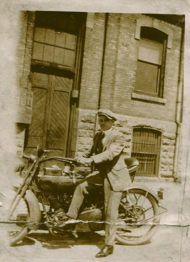 Minnie married Omer Godard, who hailed from Saint-Jérôme, Quebec. The expression “opposites attract” applies here. Omer was argumentative, a bully, wherein Minnie was more of a gentle soul. Perhaps Minnie was enamored by Omer’s dashing and debonair style, as you see him here, dressed up and posing near his “wheels”, a Harley-Davidson motorcycle, but his true demeanor belied that positive description, a tale I’ve told before in this very forum.