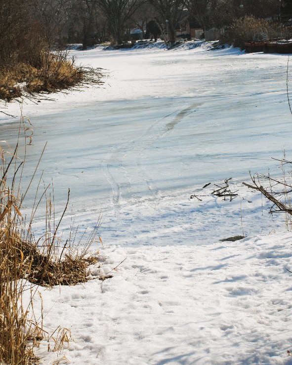 I could see skid marks where Jacob, the Park’s resident catch-and-release fisherman, had dragged his shanty to shore once he decided the ice was unstable. The last time I’d been here, albeit briefly, he still had the shanty in place.