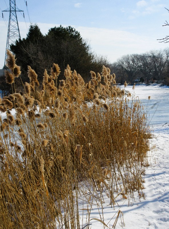 While I was grateful the brutal cold, snow, icy roads and fierce winds had finally subsided and I was able to return here, it was far from safe and most of the time I walked in the snow or grassy areas to avoid the ice. Even the soft ice might present a slip-and-fall issue. It still looked desolate, the Phragmites waving their heads in the gentle breeze and ice and snow were present at “The Point”, the place where both sides of the Creek merge.