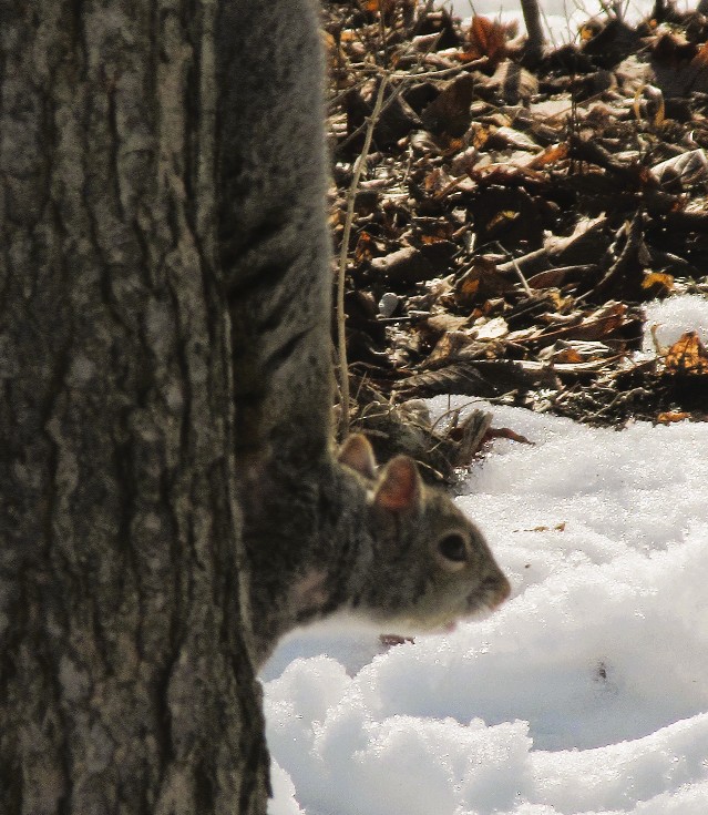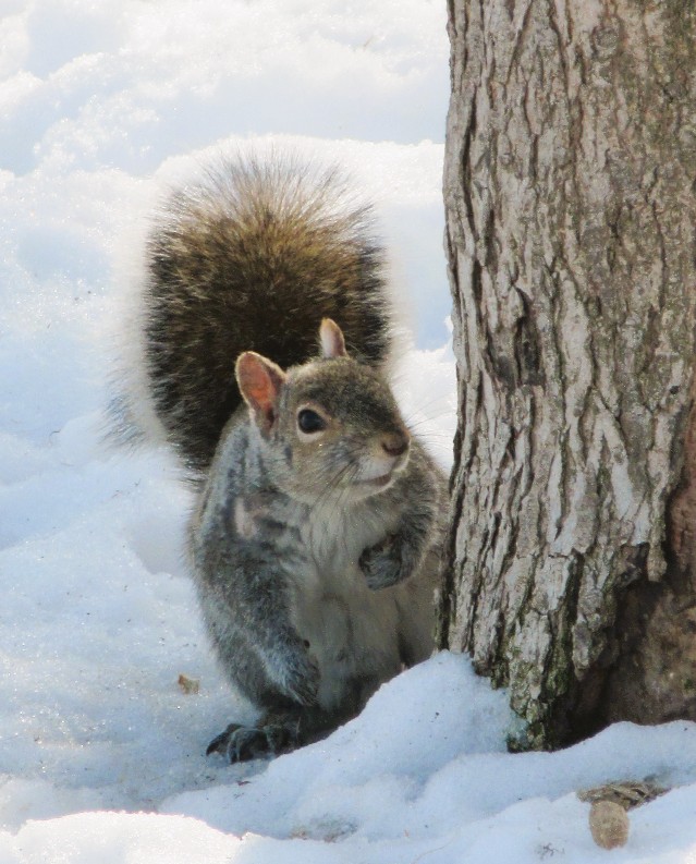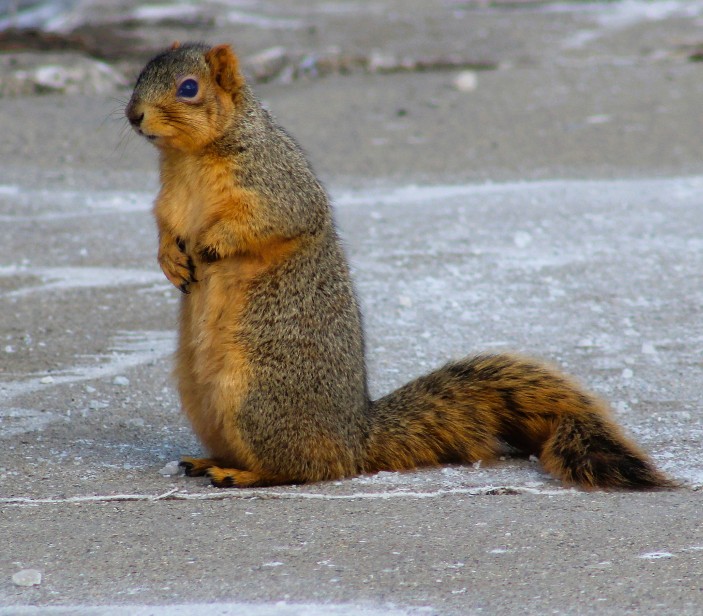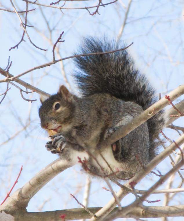 As I left the perimeter path, near the pavilion I saw a solo Fox Squirrel standing on haunches on the salt-stained cement. It was Penelope, Parker’s main squeeze. Parker, as longtime followers know, was my favorite Park furry friend. He did not survive the Winter of 2024-2025, but his mate, Penelope, did. I offered to take her home so we could celebrate “Gal-entine’s Day” but she stayed put, despite my offer to make peanut butter and jelly sandwiches. She was content to grab a single peanut and scampered off soon thereafter.