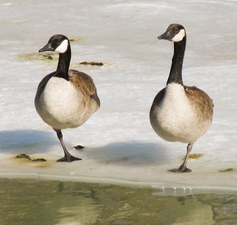 At the Creek shoreline there were a lot of waterfowl, most of them mingling on the ice. I laughed out loud at these two Canada Geese – the sight of them took me way back to elementary school and “Field Day” and two-legged races. It was at the end of the school year, we had a picnic, outdoor games and got ribbons for prizes. Only these two weren’t so animated, but their respective poses, perched on the poop-strewn ice did give me cause to pause for some photos.