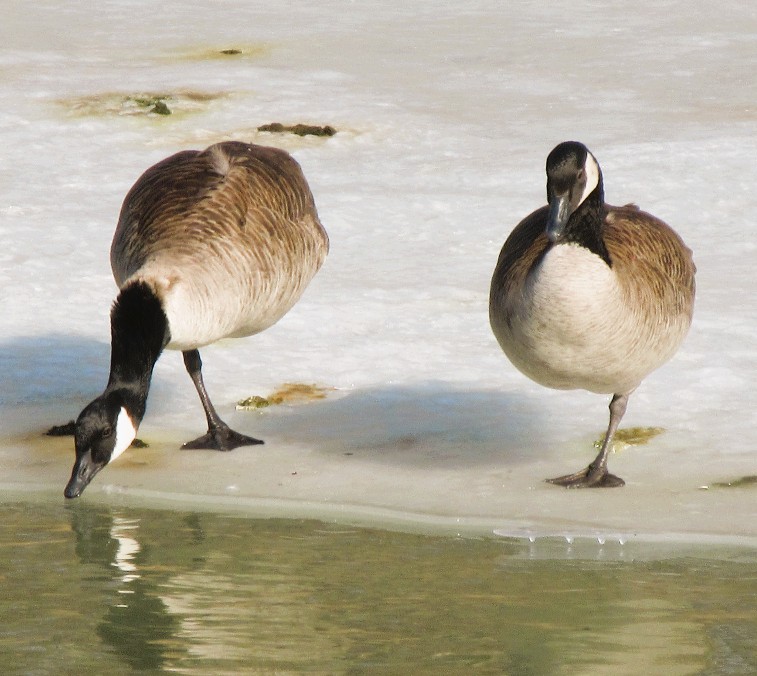 One of the geese suddenly bent over – was it thirsty, or wanted to take a gander at its reflection in the icy-cold water? Pretty fancy footwork, bending down like that, still on one leg. Balance is everything, right?