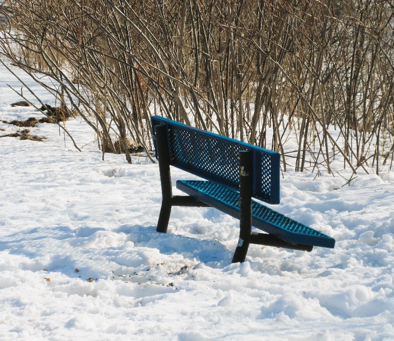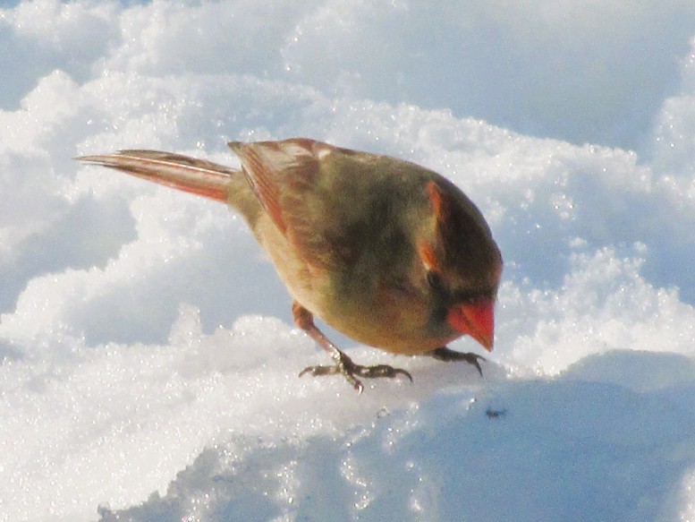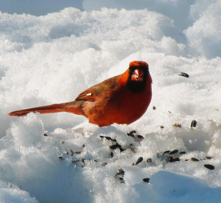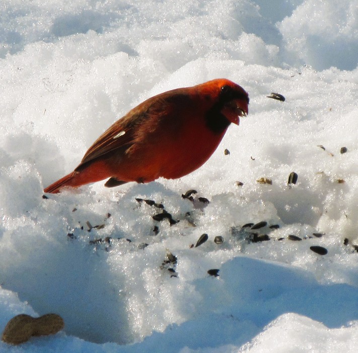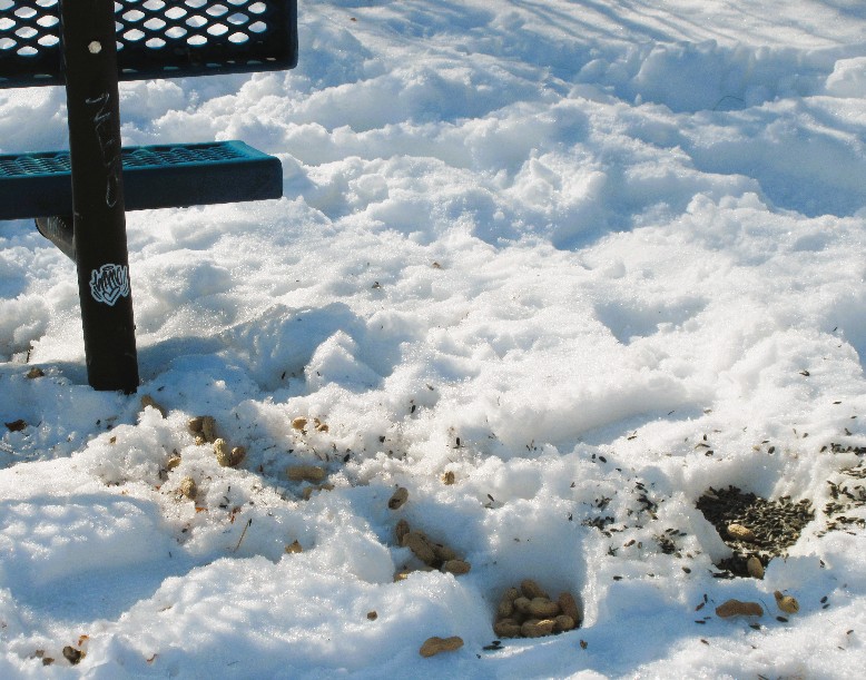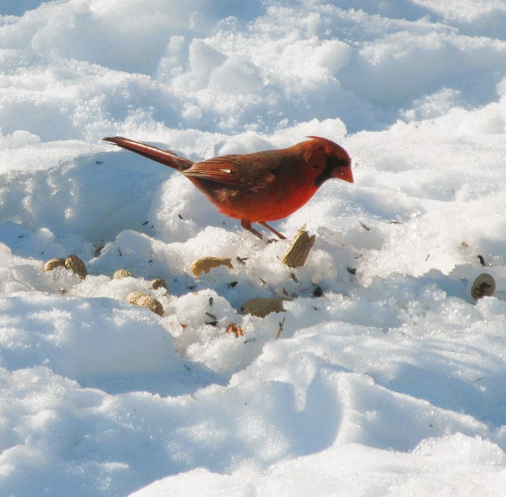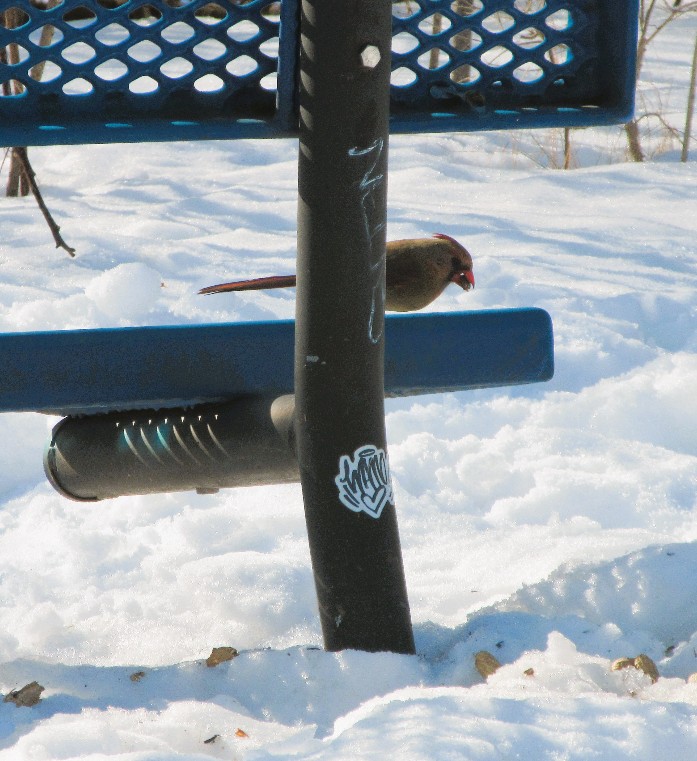 … I shielded my eyes from the sun to gaze into the sky, searching for my pair of Northern Cardinals that always find me. They announce their arrival in a series of tweets. Sure enough, just as I paused at this park bench, the year-around spot where I leave them sunflower seeds and peanuts, the lovebirds flew over to see me. Too bad I didn’t get that photo as they perched on a branch, side by side, while I was busy stomping out a place in the snow to drop off their treats, as you see below …
