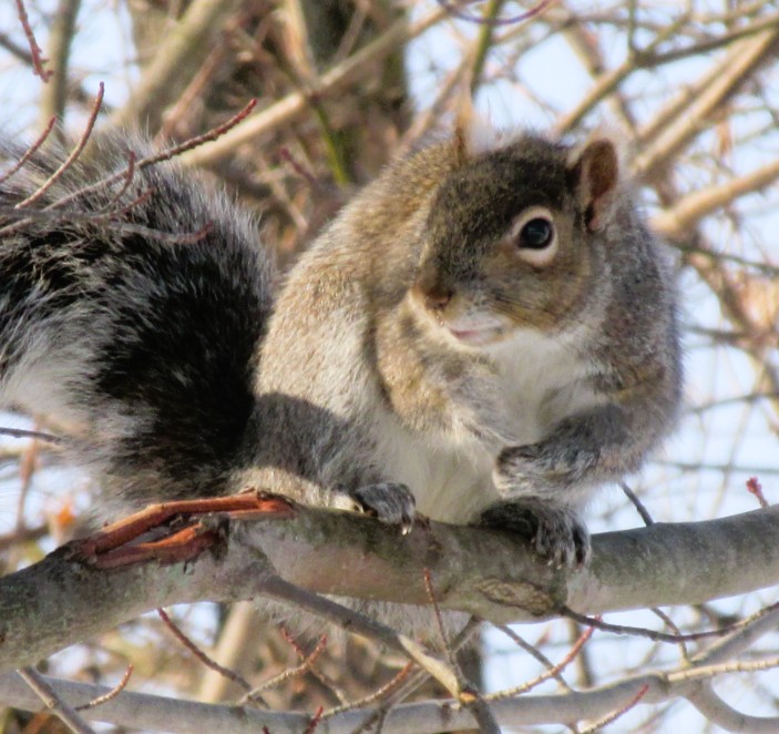 As I left the perimeter path, near the pavilion I saw a solo Fox Squirrel standing on haunches on the salt-stained cement. It was Penelope, Parker’s main squeeze. Parker, as longtime followers know, was my favorite Park furry friend. He did not survive the Winter of 2024-2025, but his mate, Penelope, did. I offered to take her home so we could celebrate “Gal-entine’s Day” but she stayed put, despite my offer to make peanut butter and jelly sandwiches. She was content to grab a single peanut and scampered off soon thereafter.
