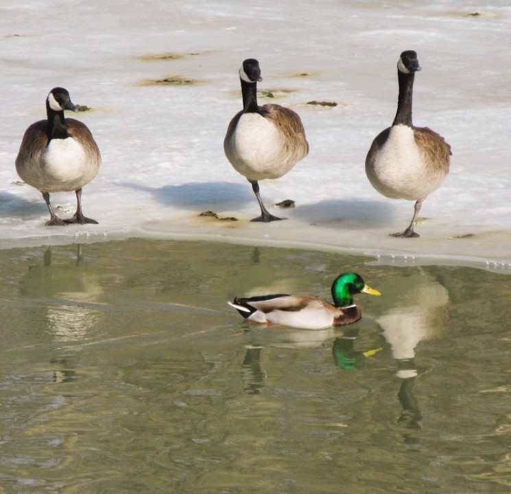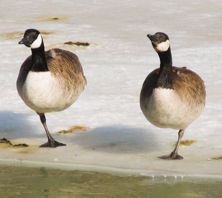 At the Creek shoreline there were a lot of waterfowl, most of them mingling on the ice. I laughed out loud at these two Canada Geese – the sight of them took me way back to elementary school and “Field Day” and two-legged races. It was at the end of the school year, we had a picnic, outdoor games and got ribbons for prizes. Only these two weren’t so animated, but their respective poses, perched on the poop-strewn ice did give me cause to pause for some photos.