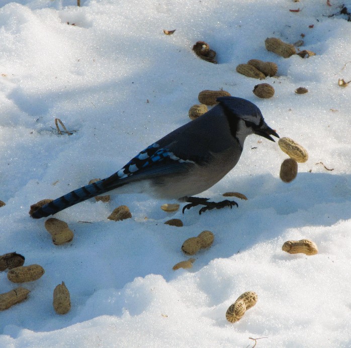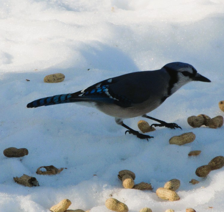 There were not as many squirrels as in past years, so as I ambled along, leaving peanuts in the usual spots, my second trip around, I was happy to see most of the peanuts I had left an hour before were now gone. Of course, it might have been the piggy Blue Jays. They are famous for stealing in-shell peanuts from right under a squirrel’s nose. I found a few Jays busying themselves, shaking and/or tossing the peanuts into the air to test their weight, then flying off with a peanut to add to their cache of treats.