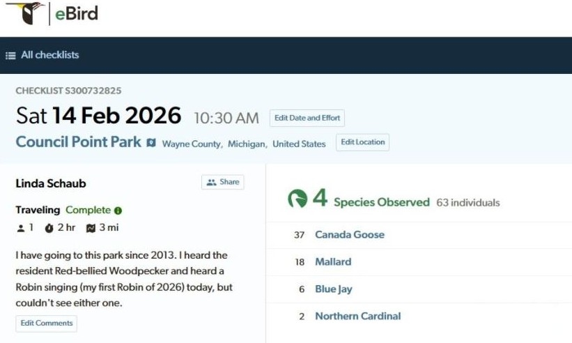 It was my third bird count in two days. The event brings together birders or anyone who will stop for 15 minutes, anytime over the course of four days (always over President’s Day weekend), to count how many birds they see in one location, then submit their findings to the official GBBC website, or to the eBird website (which is where I always submit my findings). These sites work hand in hand to collect information on wild birds. This was my submission.