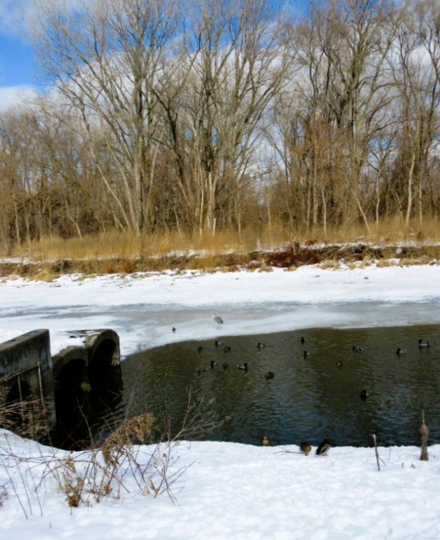 Harry was walking on the other side of the Creek in an effort to escape little ol’ me, who had arrived earlier, camera in hand and was clicking away as he stood by himself on the ice, pondering life and why he didn’t live in a warmer clime.