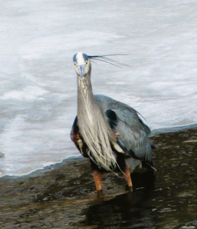 No doubt miffed at me bigtime, Harry hopped onto the icy ledge, dripping wet and looking scrawnier than his already-scrawny self, with his ornamental head breeding feathers (a/k/a occipital plumes) askew.