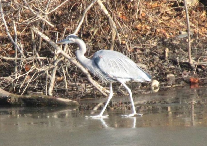 Although this gangly Great Blue Heron walked very precariously on the ice, all the while searching for a perfect perching spot, he finally decided it was easier to just wade in the icy Creek enroute to his destination.