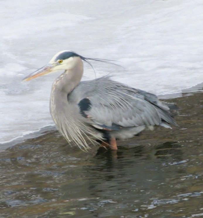 No doubt miffed at me bigtime, Harry hopped onto the icy ledge, dripping wet and looking scrawnier than his already-scrawny self, with his ornamental head breeding feathers (a/k/a occipital plumes) askew.